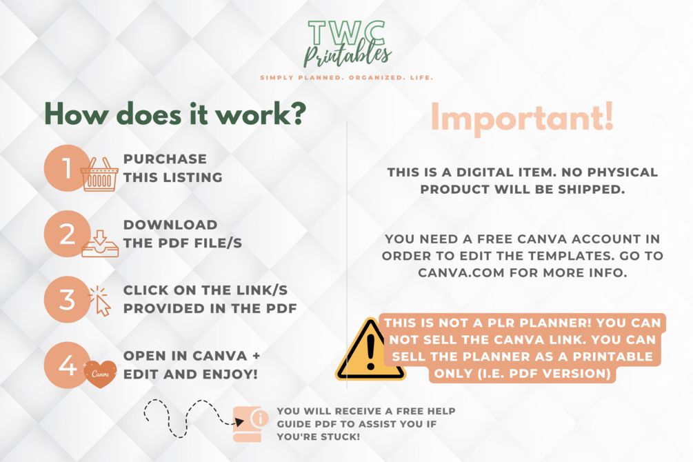 - Sell the final edited version as a printable planner (PDF/JPG)