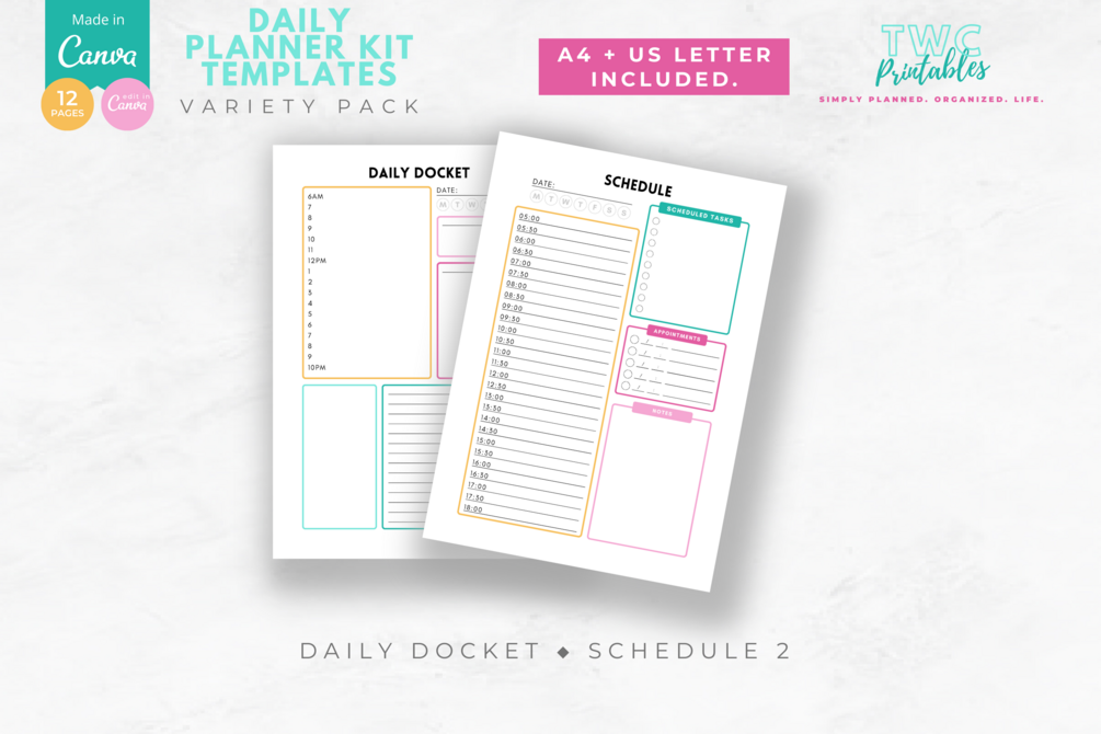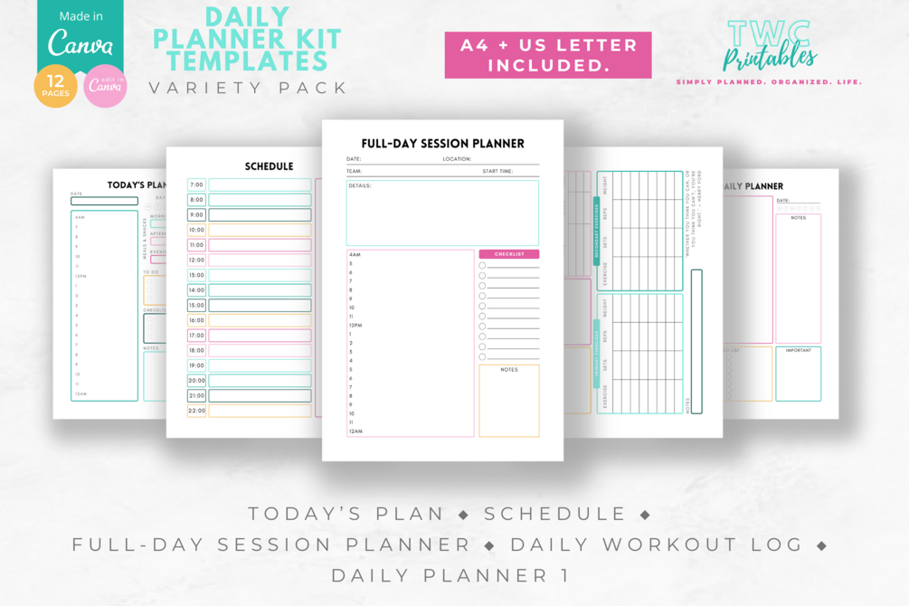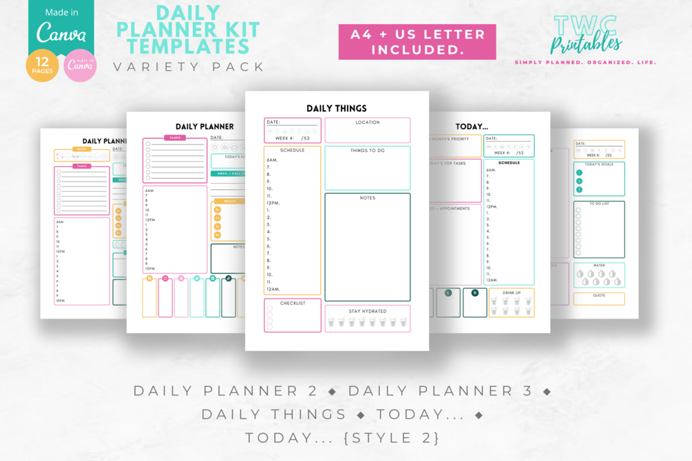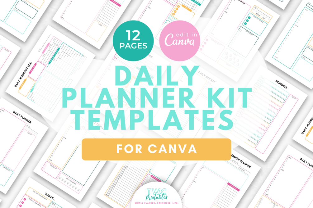 The Daily Planner Kit Templates for Canva contain 12 pages to play around with.